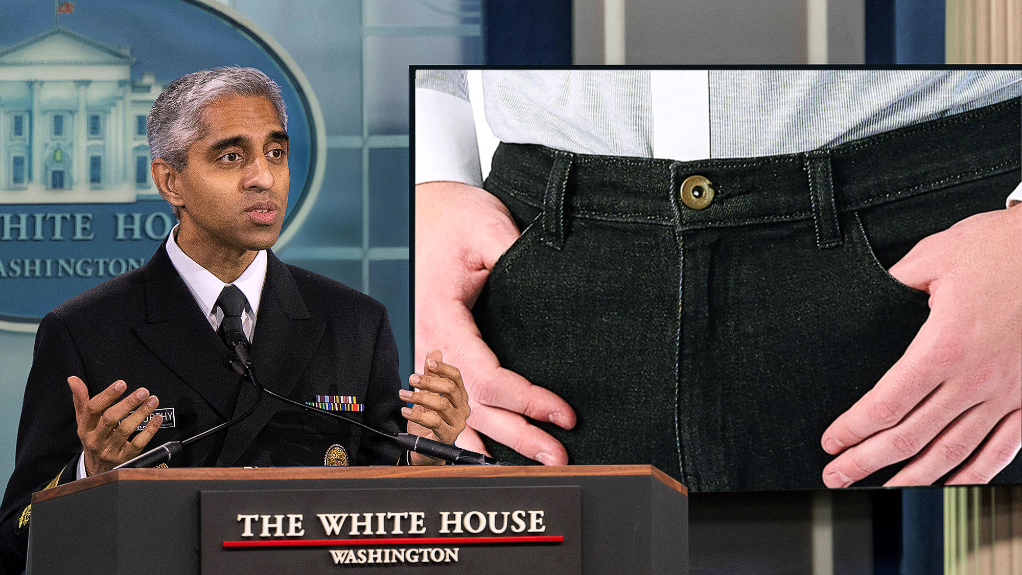 WASHINGTON—Noting that the fasteners commonly found on most trousers were not merely ornamental, Surgeon General Vivek Murthy issued an advisory to the American public Thursday in which he clarified that people were supposed to be able to button their pants. “It should be a smooth effortless action that involves no protracted struggle to connect the two sides of the garment’s waist,” said Murthy, who added that buttoning your pants only to moments later have a seam rip or a button fly off still fell short of the government’s recommended clothing standards. “Leaving your shirt untucked so no one can tell that your pants are not buttoned or declaring that all your pants shrunk several sizes in the dryer are also unacceptable solutions. In addition, pants are meant to accommodate basic inhalation and exhalation, so you should be capable of taking a deep breath while wearing them.” At press time, the surgeon general’s office had received thousands of complaints about pants, and a visibly exasperated Murthy told Americans to just forget about his advisory and go buy themselves a nice pair of elastic jeggings.