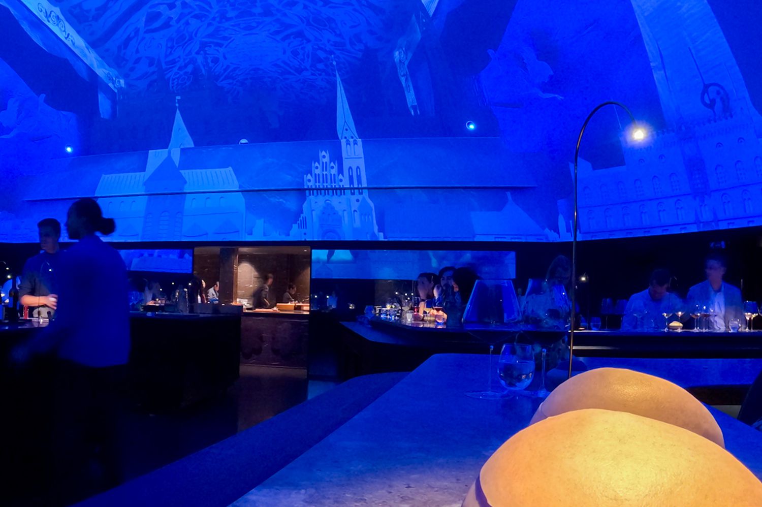 After several more snacks, guests were led to the second floor and guided across a glass-bottom walkway, where wine cellar racks holding some 10,000 bottles were visible beneath our feet. We entered a dimly lit corridor. Almost magically, the wall slides opened to reveal the most magnificent planetarium-style domed dining room filled with a maze of seating and images projected all around. I was awestruck by the impressive space as I took in the first scene: a vibrant coral reef so lifelike it felt as if I was under the sea.