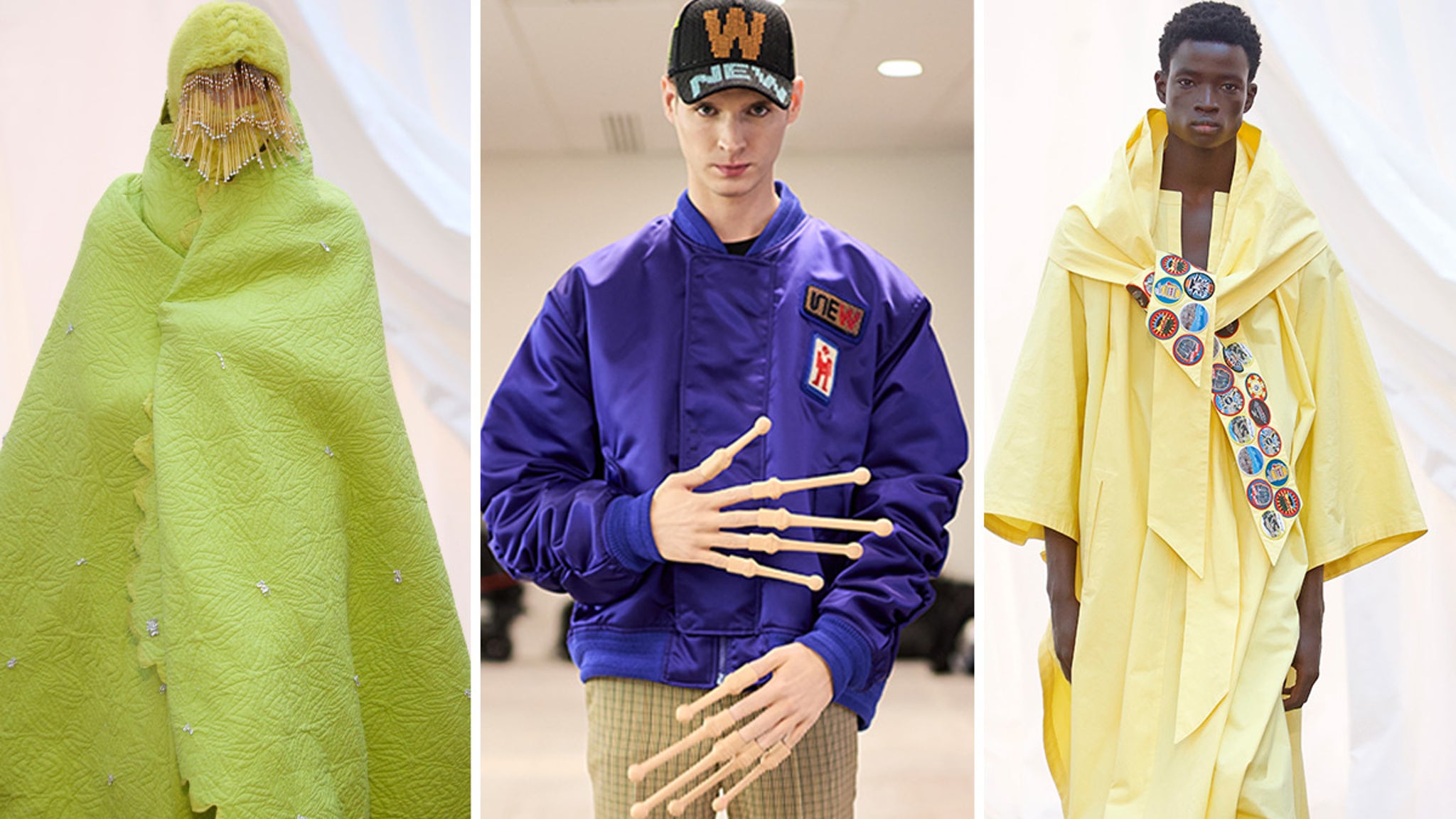 Yet, it wasn’t just Beirendonck bringing bizarre styles to fashion week this winter. The Clermont Twins made a splash sitting front row at the Bluemarble Menswear show in near-identical getups featuring feathers, camouflage, and shield sunglasses.